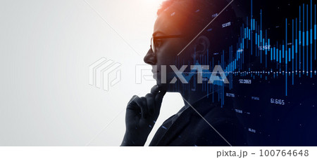 考える女性とチャート バナー・広告向け横長ビジュアル