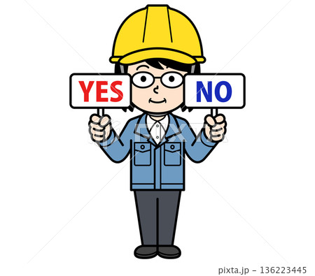 YESとNOの札を持つヘルメットをかぶった現場監督の女性