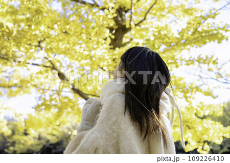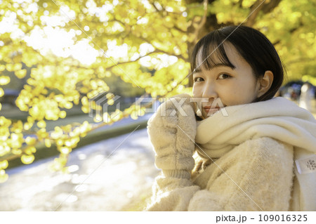 秋冬の公園を散策する若い女性