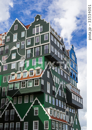 Zaandam, Netherlands - May, 11 2018; Famous touristic Inn hotel in Zaanstad with a exterior of old dutch houses, The Netherlands in the evening.