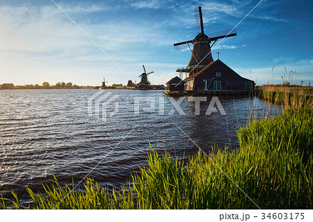 Traditional Dutch windmills with canal in Zaanse Schans near the Amsterdam, Holland