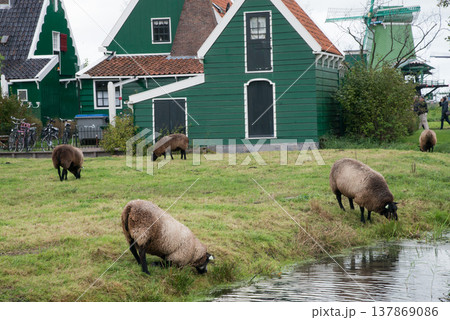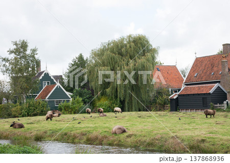 Dutch typical landscape. Traditional old dutch windmill with old houses against blue cloudy sky in the Zaanse Schans village, Netherlands. Famous tourism place. Sheep grazing on green grass.