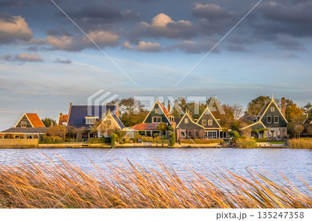 Cityscape of Dutch houses at Zaanse Schans. Typical wooden houses above sea.