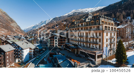 Aerial view on Zermatt Valley town and Matterhorn Peak in the background in the morning in Switzerland. Magical Swiss town with no cars and electric trains going up the mountains.