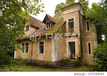 An old, abandoned country house surrounded by dense greenery and trees. Concepts of abandonment, decay, forgotten places, nature reclaiming buildings, and urban exploration.
