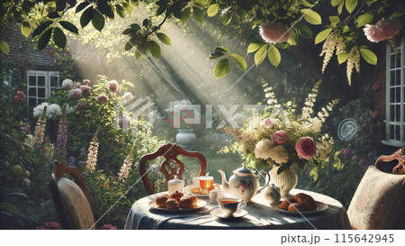 Experience delightful afternoon tea on beautifully arranged terrace fine porcelain teacups and vintage silver teapot. Enjoy luxury of delicate pastries surrounded flowers.