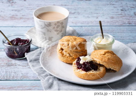 スコーンでクリームティー アフタヌーンティー ミルクティー ジャムのせ 青のウッド背景