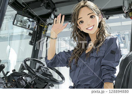 タラクターの運転席で手を振る笑顔の女性のイラスト素材
