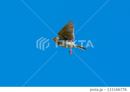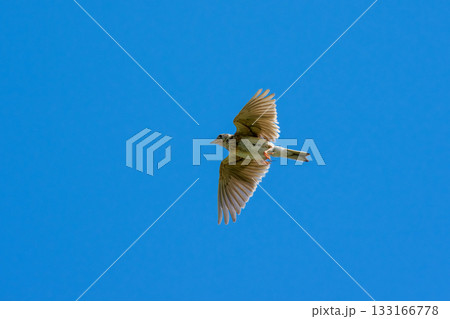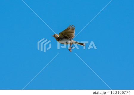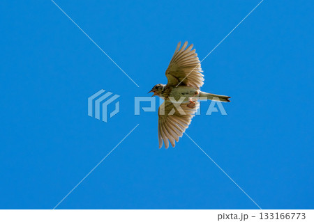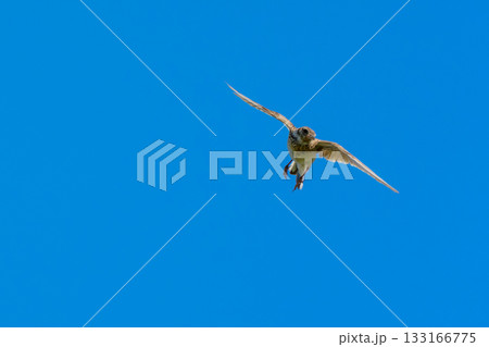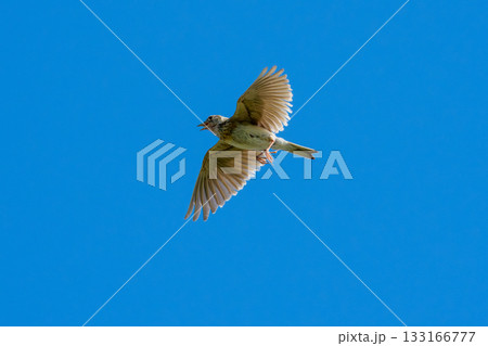青空を飛ぶヒバリ(学名 Alauda arvensis)
