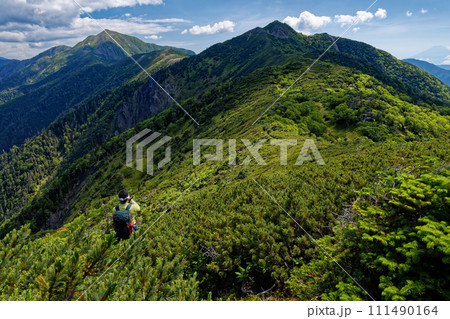 南アルプス・希望峰の稜線を行く登山者と茶臼岳・上河内岳の眺め
