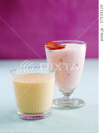 A strawberry smoothie and a peach yogurt drink