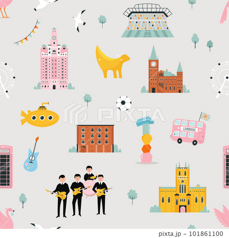 Vector colorful design, banner with icons, famous symbols of Liverpool.