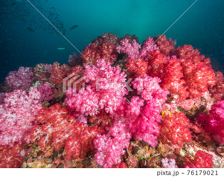 ピンク色のソフトコーラルと赤い海綿の群生 (メルギー諸島、ミャンマー)
