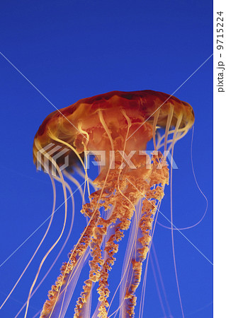 Sea nettle jellyfish in a water tank, underwater, with long tentacles.