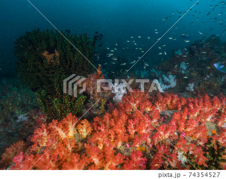 ソフトコーラルとスズメダイの群れ (メルギー諸島、ミャンマー)