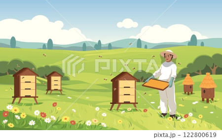 Worker on apiary. Male beekeeper hold honeycomb, collect honey and raise bee. Apiculture, beekeeping process in uniform. Harvesting recent vector scene