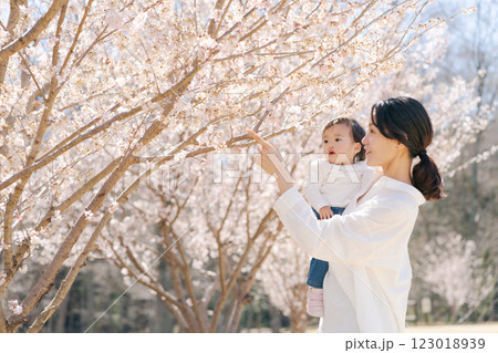 桜の咲く公園でランドセル姿の娘にリボンをつける母親