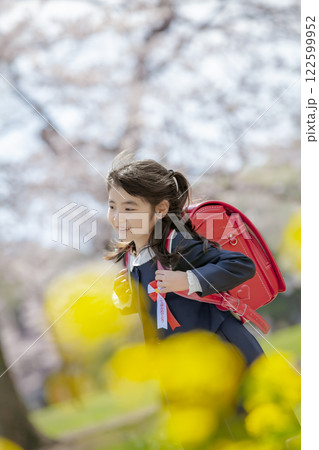 菜の花と桜の咲く公園を歩く小学一年生