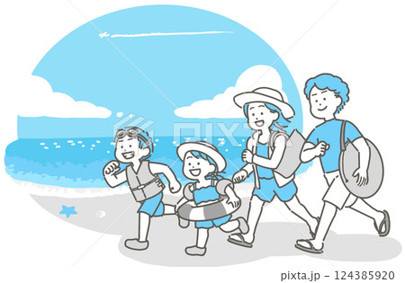 水着姿の夏の家族と海のイラスト