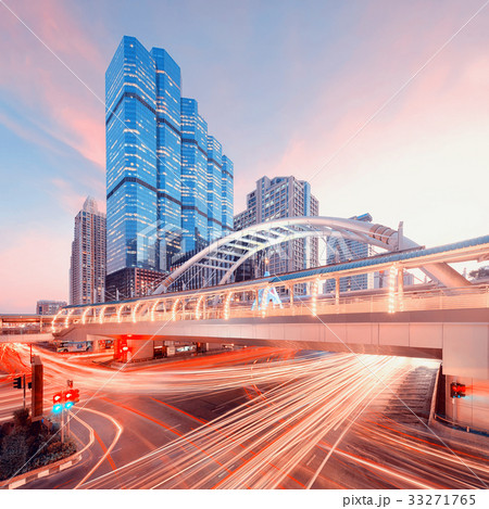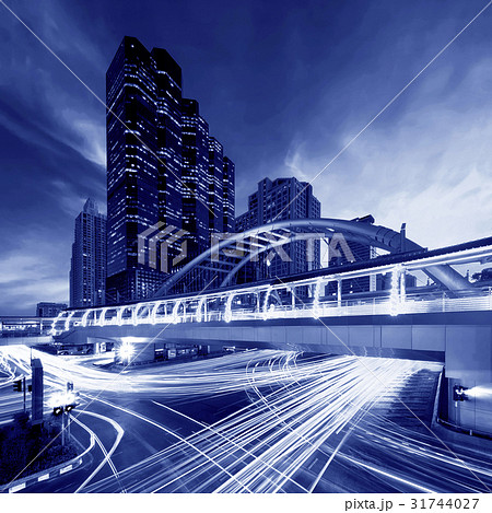 Landscape building modern business district of Bangkok. X-shaped expressway, sky train railway in the foreground at dusk.