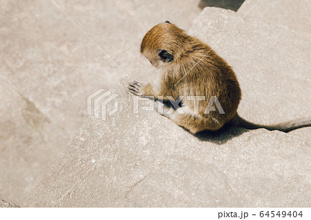 Back view of sitting baby monkey at Batu Caves in Kuala Lumpur, Malaysia