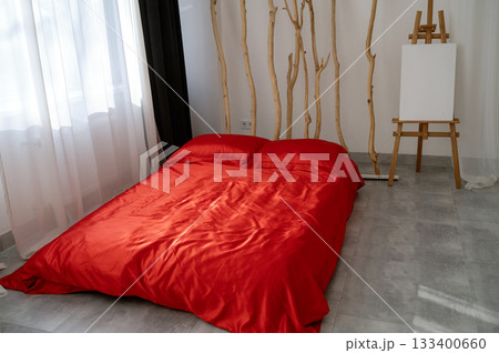 A bedroom with a bed in a room