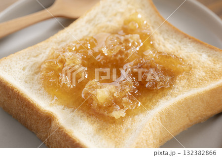 焼きたてのトーストに巣みつをのせた朝食シーン
