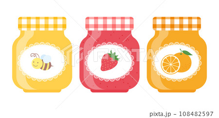 瓶に入ったはちみつ、いちごジャム、マーマレードのイラストセット