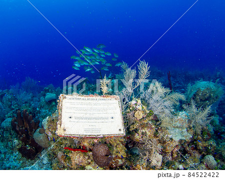 珊瑚礁に設置された海洋保護に関する注意書き (グランドケイマン、ケイマン諸島)