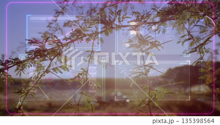 Displaying shrub branch extending across rural desert plain, with neon holographic HUD elements
