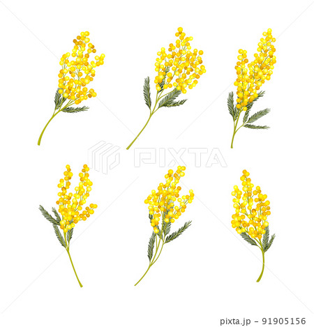 Wattle or Mimosa with Bipinnate Leaves and Yellow Racemose Inflorescences Vector Set
