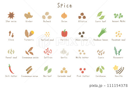 白い背景にスパイス集合・白い背景にカレースパイス・スパイスの集合イメージ