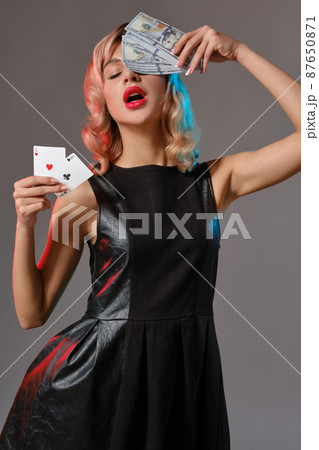 Blonde girl in black stylish dress holding some money and cards, posing against gray background. Gambling entertainment, poker, casino. Close-up.