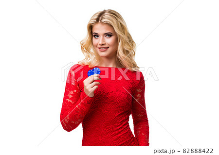 Caucasian young woman with long light blonde hair in evening outfit holding playing chips. Isolated. Poker