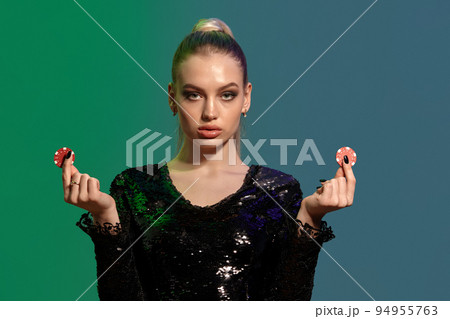 Blonde woman in jewelry and black sequin dress. She is showing two red chips, posing on colorful background. Gambling, poker, casino. Close-up
