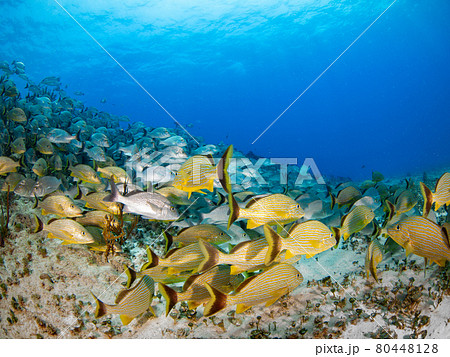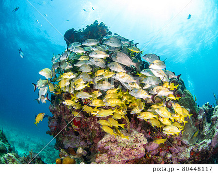 珊瑚礁に群れるセーラーズグラント(イサキの仲間) (プラヤ・デル・カルメン、メキシコ)