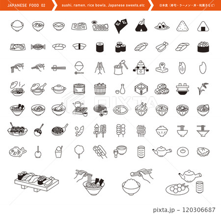 日本食のアイコンセット。寿司やラーメンなどのベクターイラスト。和食の素材。