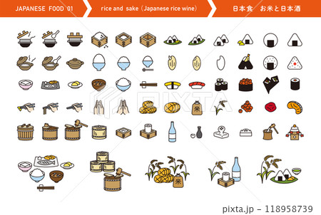 日本食のアイコンセット。お米や日本酒のベクターイラスト。