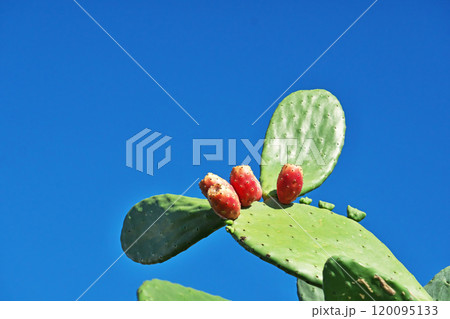 熟した赤い実を付けたウチワサボテン(秋、十月)