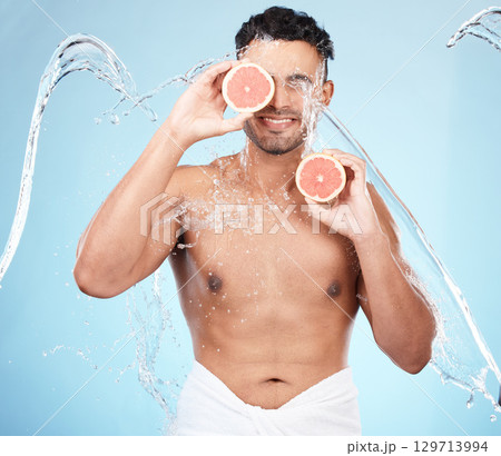 Skincare, beauty and water splash, man with fruit for vitamin c facial detox for healthcare, natural healthy skin and smile. Water, wellness and sustainability, organic luxurycleaning and grooming.