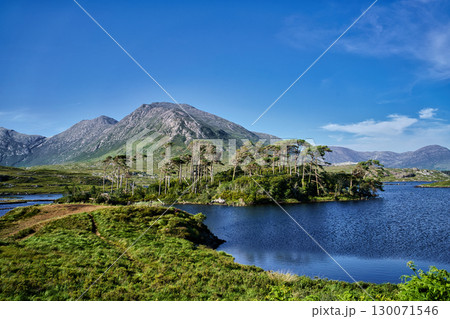 Idyllic landscape featuring mountains, trees, and a lake under a bright blue sky in Ireland.