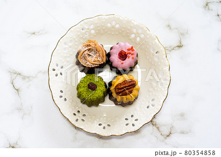 お皿にのったカヌレとピンクのマカロン - かわいいデザート・スイーツの素材