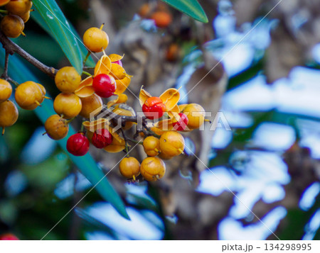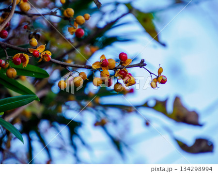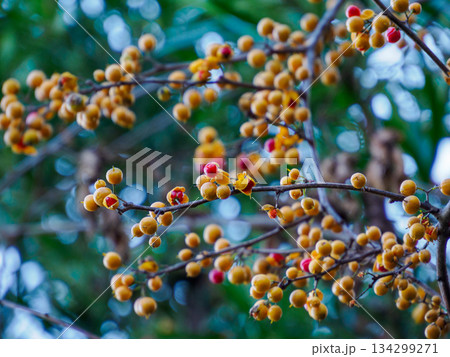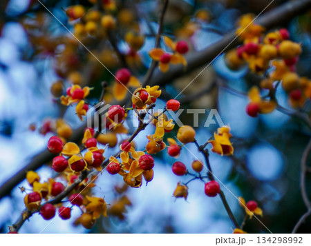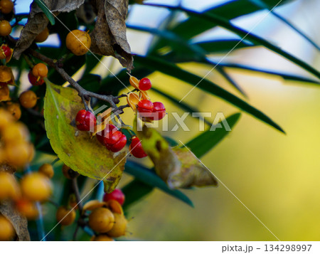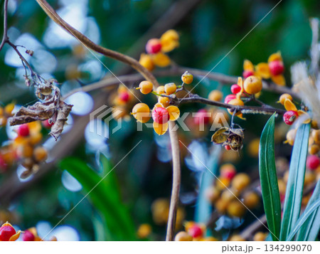 黄色と赤色のツルウメモドキの実(秋、十一月)
