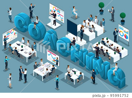 Isometric people person, 3d businessmen, girl coaching, business training, board with graphs, concept of counseling group of people, office work, High tech technology