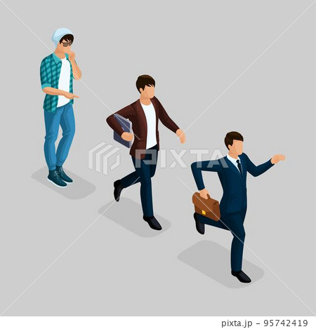 Trendy Isometric people, 3d businessman, development of start-up, creative young people, freelancers, team of professionals, business creation, brainstorming on light