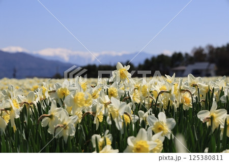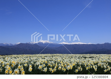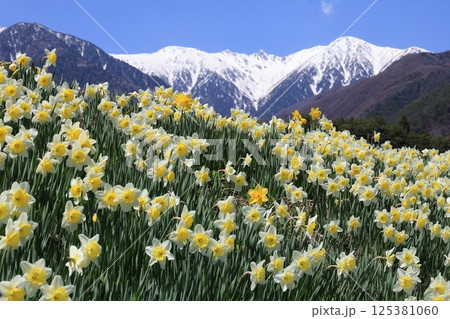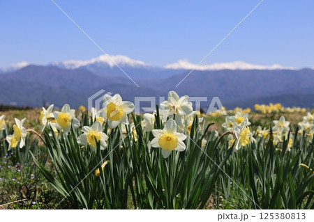 日本の春、スイセンと青空とアルプスの雪山のコントラスト – 長野県駒ヶ根市光前寺前