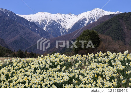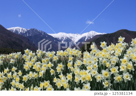 雪の中央アルプスを背に咲き誇るスイセン – 長野県駒ヶ根市