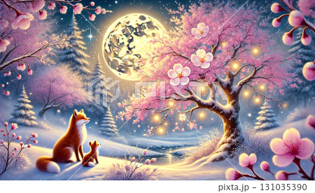 満月に照らされた雪の森で親子の狐と桜の木が輝く幻想的で温もりあふれる冬の夜の風景