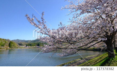 春の長閑な桜咲く川沿いの風景