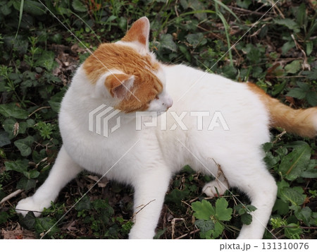 寒緋桜の花と白い猫
